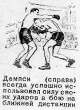 Джек Демпси, стремившийся в своей тактике к встречному бою, всегда старался сузить возможности противника в маневрировании. Преследуя его по рингу и стараясь сблизиться с ним, он пользовался каждым удобным случаем прижать его к канатам. Это давало ему возможность обрушить на противника силу своих коротких ударов. Его противник, будучи прижатым к канатам, терял устойчивость и становился удобной мишенью для серий Демпси.