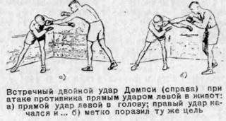 Джек Демпси говорил, что при этой атаке подбородок противника раскрыт дважды, т. е. в него можно успеть нанести два встречных удара. Когда противник наносил прямой левой в туловище и готовился ударить справа, Демпси ломал его атаку быстрым прямым ударом левой в подбородок и дублировал его таким же ударом правой рукой. Если противник прерывал свою атаку после удара левой и успевал отойти назад, то это было его счастьем, но если Демпси успевал довести свою контратаку до конца, противник всегда оказывался на полу.