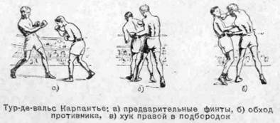 Тур-де-вальс принадлежит к числу наиболее остроумных и в то же время трудных в исполнении трюков, когда-либо изобретавшихся лучшими мастерами ринга. «Вальсовым ударом» Карпантье назвал его потому, что его выполнение требует своеобразного трехшажного темпа. Он применял его против медлительных и осторожных противников, которые на всякое приглашение начать схватку на дальней дистанции предпочитали держаться в защитной стойке или пытались войти в клинч.