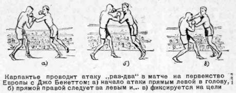 Неожиданность этому удару Карпантье придавал отвлекающими финтами, быстроту — силой толчка правой ноги от пола. Резкость удара Карпантье усиливал рывком правой ноги влево в тот момент, когда вес тела переходил на его далеко вышагивающую вперед левую ногу.