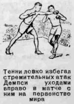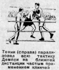 Джин Тенни отлично продемонстрировал эту тактику в бою с Демпси, заставляя его пробегать мимо себя. Время от времени Тенни встречал его джебами и контратаками «раз-два», а при прорывах Демпси, клинчевал. Все попытки Деммси атаковать и навязать Тенни инфайтияг не имели успеха. Тактика Тенни восторжествовала к концу 10-раундового боя, когда Демпси был окончательно изнурён и проиграл бой на очки.