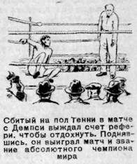 Джин Тенни в матче с Демпси на первенство мира а 1927 г. был сбит им в глубокий нокдаун. Тенни выждал счёт рефери на полу до 9 и, поднявшись на ноги, сумел преодолеть яростные атаки Демпси применением клинчей. В результате 10-раундный бой был выигран им на очки. Только самообладание и правильное поведение Тенни в нокдауне и после него спасли его от нокаута и дали ему возможность сохранить звание чемпиона.