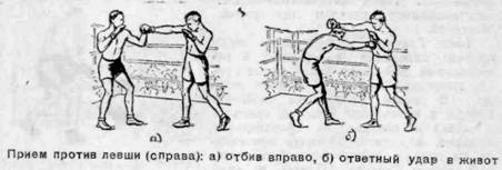 При атаках левши прямыми ударами правой в голову, а также при завязке им боя этими же ударами очень выгодно отбивать бьющую руку вправо левой рукой, выводя ею противника из равновесия. Для этого следует держать свою левую руку с внешней стороны правой руки противника. После отбива удобно отвечать правой рукой, посылая ею хуки и прямые удары в голову ила туловище.