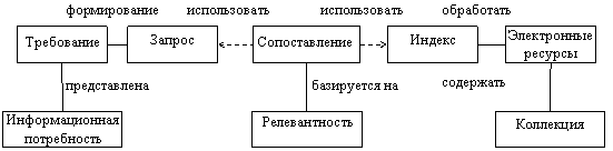 С одной стороны, у человека-пользователя есть информационная потребность, представляемая некоторым требованием, которое затем преобразуется в запрос. С другой стороны, в поисковых северах имеются коллекции электронных ресурсов, которые индексированы для цели выполнения поиска. В результате обработки запросов поисковые серверы возвращают множество релевантных документов пользователям.