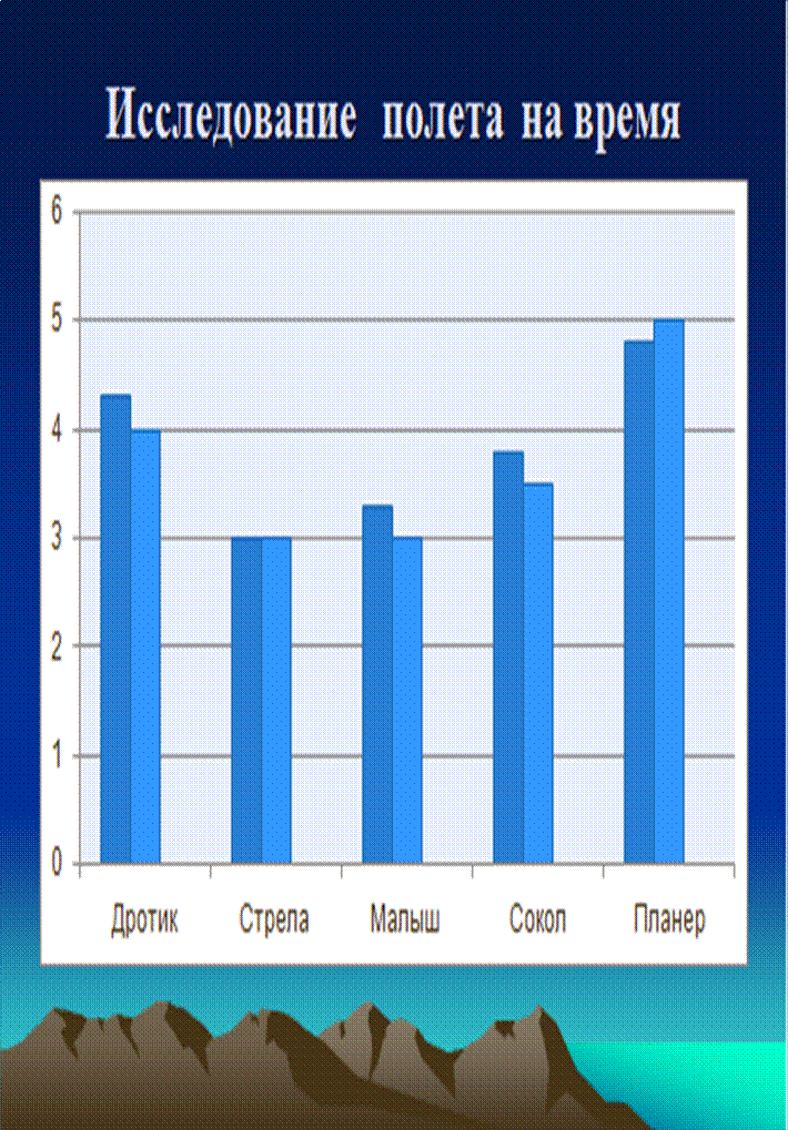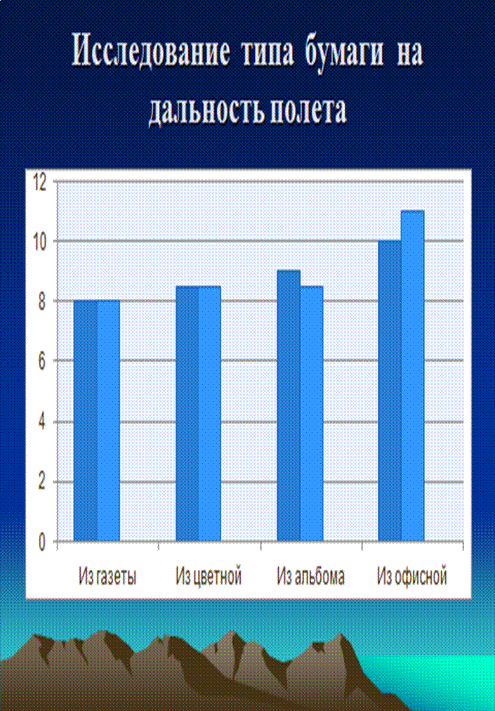 Вывод : Таким образом, наша гипотеза подтвердилась: дальше всех пролетел «Дротик» (15метров), дольше всех находился в воздухе «Планер» (5секунд), лучше всего самолетики летают, сделанные из офисной бумаги.