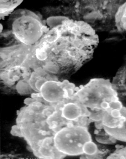 Следует отметить, что химический состав раствора существенным образом влияет на состав осадка. Так, например, результаты микрозондового рентгеноспектрального анализа образцов железа, восстановленных из электролита, полученного путем растворения окалины (состав, %: Fe2O3 90,53; Fe3O4 4,9; SiO2 3,30; CaO 0,11; S 0,007; P 0,006; Al2O3+MgO+K2O+Na2O+TiO2 S1,117) в хлороводородной кислоте и промышленным пирометаллургическим способом (ПЖРВ-2). В результате электронномикроскопического исследования было выявлено, что частицы порошка ПЖРВ-2 имеют округлую каплевидную форму, а частицы восстановленного железа – сферическую, с отчетливо наблюдаемыми на поверхности ямками травления и субзародышами (рис. 1). Микроанализ показал, что железо, полученное восстановлением из электролита, содержит 0,45% Al, <0,1% Si, 0,2% Ti, <0,1%Ni, а металлургическое железо – 1,2% Al, 0,3% Si, 0,25% Ti, 0,25%Ni, 0,35%К.