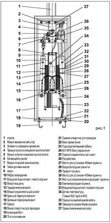 Корпус закрывает гидравлический поршень, цилиндр двойного действия и балансирующую стрелу пружину.