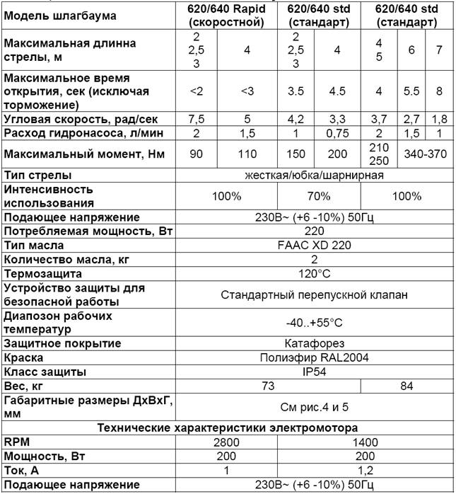 Таблица 1 Техническое описание шлагбаумов