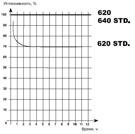 ВНИМАНИЕ: график получен при температуре t=24°С. Подвергаясь воздействию прямого солнечного света, интенсивность может ослабнуть до 20%