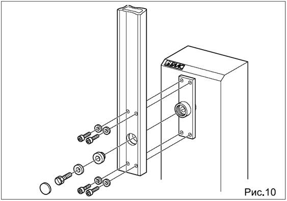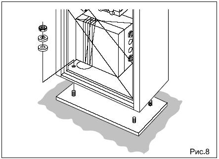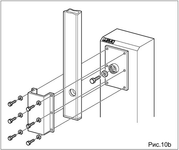 • Используя четыре болта и шайбы из комплекта, закрепите стойку к плите основания, как показано на рис.8. Помните, что крышка колонны должна быть лицевой стороной к зданию.