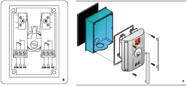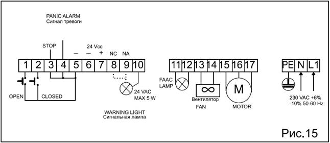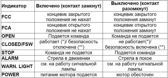 Данная клемма предназначена для подключения всех устройств (фотоэлементы, сенсорные пневматические концевые выключатели, магнитные катушки) с нормально замкнутыми контактами, которые предотвращают движение стрелы в случае какого либо препятствия в зоне ее действия.