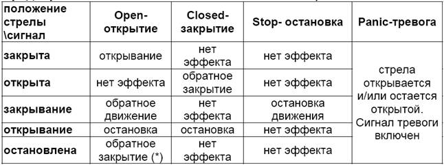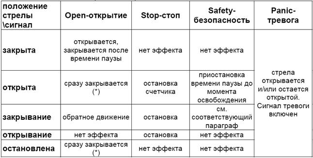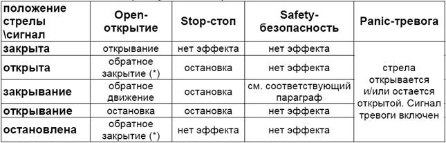 Сигнал на открывание во время закрытия всегда возвращает стрелу в открытое положение.