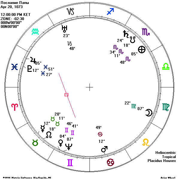 После смерти Ярослава его сыновья вели междоусобную борьбу, и для укрепления своих позиций один из князей, Изяслав, заручился поддержкой папы Римского Григория VII. 20 апреля 1073 г. папа направил Изяславу послание, в котором закреплял за ним "королевство русское". Эта дата, практически не вспоминаемая историками, тем не менее, показывает значительный резонанс уже известных нам астрологических факторов: Юпитер находился в соединении с Плутоном в Рыбах, знаке Нептуна, а сам Нептун с Венерой в Близнецах (в гелио-карте) был в квадратуре к этому соединению. Попытка Изяслава опереться на формальный авторитет официального лица чужого для России архетипа (Юпитер / Плутон) провалилась, так как не была поддержана народом (Нептун / Венера).