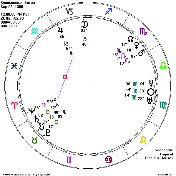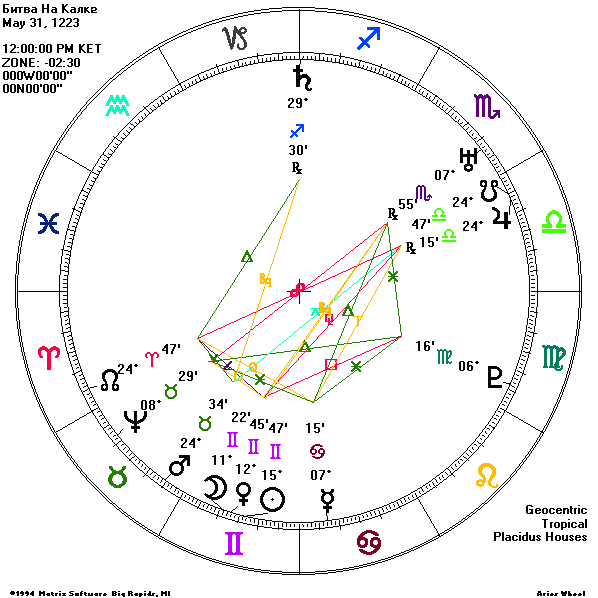 Хорошим примером, помогающих выявить различия между астрологическими показателями двух архетипов, является монгольское нашествие. В транзитной ситуации на день битвы на Калке 31 мая 1223 г. (которая так любима отечественной историографией) заметно доминируют Меркурий и знак Близнецов: соединение Солнца, Венеры и Луны расположено в Близнецах, а Меркурий делает мощные аспекты ко всем трём высшим планетам. При этом из выделенной нами ранее троицы “Юпитер – Нептун – Плутон” взаимный аспект делают только две последние планеты, и то довольно с широким орбисом. Таким образом, хотя битва на Калке была массовой и, как считается, значительной, она не имела далеко идущих последствий для развития зарождающегося этноса новой Руси.