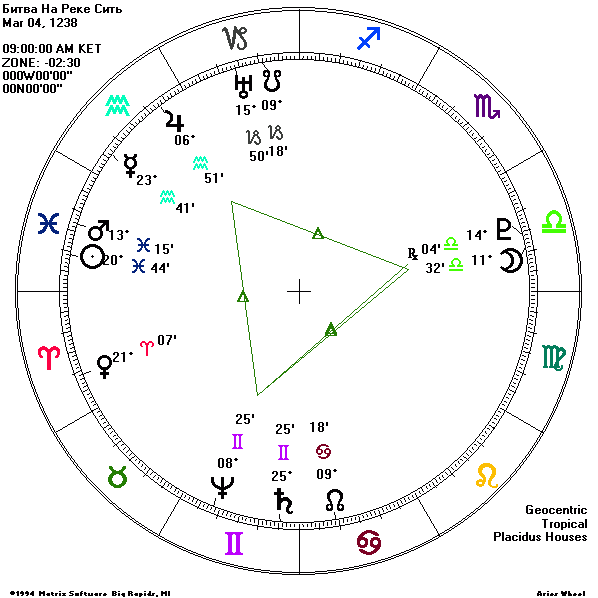Однако обращает на себя внимание другая битва, которой историками уделяется несколько меньше внимания. Это битва на реке Сить 4 марта 1238 г., которая произошла, когда монгольское нашествие достигло земель Владимирско-Суздальского княжества. Сражение закончилось поражением русских войск и смертью владимирского князя Георгия. В гороскопе на начало этой битвы мы находим… Большой трин! Его образовали Юпитер, Нептун и соединение Луны с Плутоном. И это не случайно: ведь именно Владимирско-Суздальское княжество составило в будущем основу централизованного российского государства. В борьбе за независимость именно этих земель и произошло зарождение нового централизованного русского государства, которому и соответствует выявленная нами триновая модель культурного архетипа.