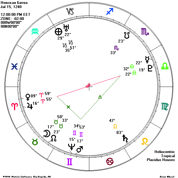 Отметим сильную проявленность темы Меркурия и Близнецов в гороскопе Александра Невского и в карте на дату Невской битвы. Чуть слабее, но тоже ощутимо, проявлена тема Венеры и её знаков. Таким образом, фигура Александра Невского оказалась ключевой для обоих архетипов – и древнерусского, и зарождающегося российского.