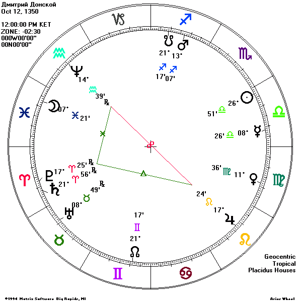 Ещё один прославленный князь, Дмитрий Донской, родился (12 октября 1350 г.) на оппозиции гео-Юпитера к Нептуну, при этом Юпитер был в точнейшем трине к Плутону, а Плутон – в секстиле к Нептуну. И опять мы видим напряжённый аспект Юпитер-Нептун! Как раз при Дмитрии Ивановиче начали чеканить собственные, русские деньги, как раз при нём Москва утвердила своё руководящее положение в русских землях, именно при Дмитрии Донском в Москве был построен каменный Кремль, как раз Дмитрий Донской ввел правило прямого наследования престола от отца к сыну (тем самым был отброшен киевский обычай, согласно которому наследником был старший в роду). Его сын Василий I стал Великим князем без санкции Золотой Орды.