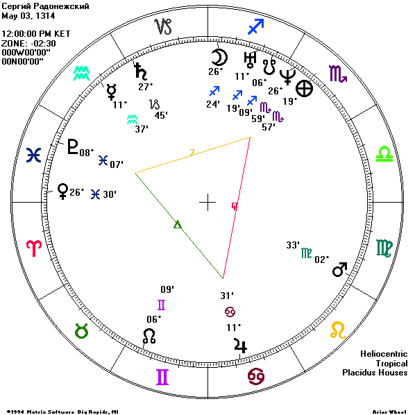 Три ключевые для истории России планеты сильно увязаны между собой и в гороскопе Сергия Радонежского, самого почитаемого русского святого (3 мая 1314 г.): Юпитер находится в трине к Плутону в Рыбах (более точно - в гелио-карте), а Нептун образует взаимную рецепцию с Плутоном, находясь в Скорпионе. При этом гео-Юпитер делает биквинтиль к Нептуну, а гелио-Юпитер – точный полутораквадрат. Хотя Венера и Меркурий имеют выраженное положение в этой карте, но более мощно звучит тема Юпитера в знаке своей экзальтации. Юпитер как символ духовного водительства взывает к народному единению, невзирая на политические границы, к преодолению культурной разрозненности. Сергий по сути заложил основы новой для Руси монастырской системы духовного учительства, преемственности знаний. Как считают историки, авторитет Сергия как духовного пастыря, благословившего Дмитрия Донского на Куликовскую битву, придал особый пафос отношению народа к этому сражению как к символическому событию защиты земли Русской.