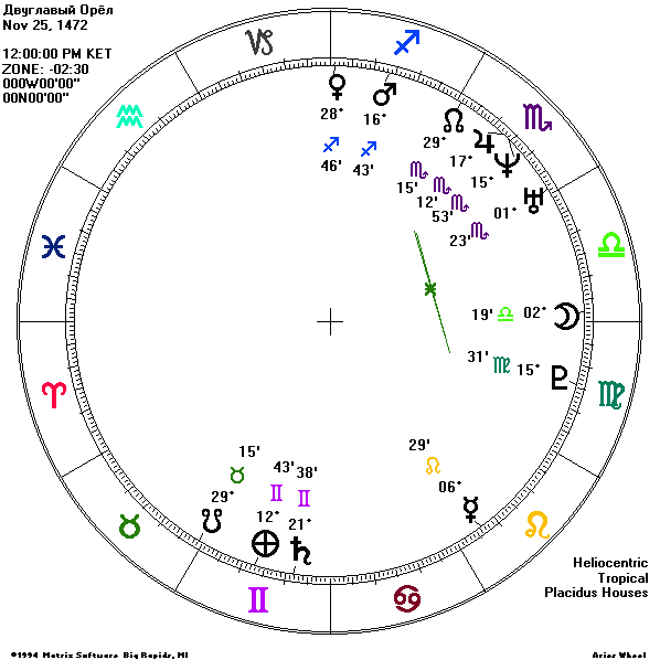 Процесс возвышения Московского государства был стремительным. К середине 15 века Русь уже стала мощным независимым государством, с которым ведущие державы той эпохи не могли не считаться. Среди большого числа событий, сопровождавших становление могучей Руси, нам хотелось бы выделить один факт, имеющий большое символическое значение и поныне. 25 ноября 1472 г., к свадьбе Великого князя Ивана III с Зоей Палеолог (племянницей последнего византийского императора), из Византии прибыл имперский штандарт династии Палеологов с изображением двуглавого орла, которому суждено было стать государственным символом России. Этот брак давал основания московской династии князей считать свою державу преемницей “второго Рима”. Именно это событие привело к зарождению концепции о Москве как “третьем Риме”. В тот знаменательный день Юпитер и Нептун были в конъюнкции в Скорпионе, знаке Плутона, делая при этом к Плутону секстиль (причём как в гео-, так и в гелио-системе). В этом гороскопе Плутон наконец зазвучал в полную силу своих имперских амбиций, геополитических претензий и заявок на религиозное лидерство. Княжение Ивана III (принявшего титул “государя Всея Руси”) было по сути уже царствованием – в полном смысле этого термина, включая аспект сакрализации власти.