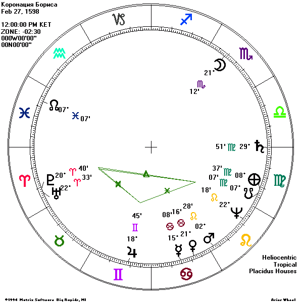 Коронация Бориса Годунова, первого за историю России выборного царя, к тому же символизировавшая конец династии Рюриковичей, произошлафевраля 1598 г., во время точного гелио-трина Нептуна к Урану с Плутоном; Юпитер в этот день формировал секстили к ним обоим. Подключение Урана к известной тройке планет помогает понять трагический конец династии Рюриковичей, подтверждает изменение типа власти и неслучайность выбора Боярской думой нового царя. Юпитер на вершине бисекстиля проясняет роль Бориса Годунова как конструктивного гос. деятеля и “хорошего царя”, но в памяти поколений он остался как неудачливый “самозванец” и “детоубийца” из-за того, что уранически были нарушены привычный уклад и преемственность власти.