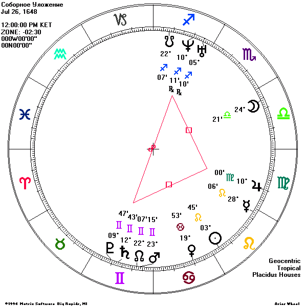 В 1648 г. Юпитер, Нептун и Плутон образовали редкую конфигурацию Тау-квадрат – как в гео-, так и в гелио-системе. На гелио-аспектах произошло мощное восстание в Москве (т. наз "соляной бунт"). Богдан Хмельницкий написал своё знаменитое письмо российскому царю с просьбой о присоединении Украины к России в июне, когда действовали и гео-, и гелио-конфигурация. Наконец,июля 1648 г., когда государь вместе с Боярской думой и Освящённым собором "приговорил составить" первый в истории России всеобщий свод законов (Уложение), Тау-квадрат в гео-системе стал наиболее точным. В это же время разворачивался кризис в религиозной жизни страны – православная церковь стояла на пороге раскола. В реальности самое важное из этих событий соответствовало наиболее точной астрономической конфигурации. Составление Соборного Уложения было уникальным по своей значимости фактом потому, что в его основу были положены все возможные авторитетные источники – древнерусские, современные, греческие, и др., – а для работы над ним по царскому указу были привлечены самые широкие круги российской общественности. Так в России родился всеобщий закон, составленный “всем миром”.