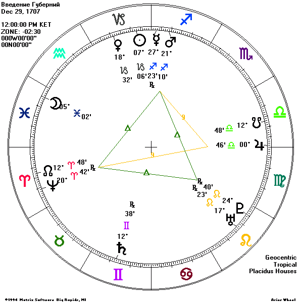 А вот другое событие этих лет – Указ о реформе административно-территориального деления (18 / 29 декабря 1707 г.) – как исторически, так и астрологически было более важным в развитии российского культурного архетипа. По сути, единым росчерком пера Петр установил новую структуру государства – разделение территории России на губернии. Произошла полная смена типа и формы власти в регионах; принцип губернского деления ощутимо отличался от исторически укоренившегося вотчинного. Пётр по сути пренебрёг национальными и культурными особенностями регионов ради налаживания системы рекрутского набора, ради усиления военного механизма. Неудивительно, что на небе в день указа сложился Большой Трин: Нептун в Овне – Плутон (и Уран) во Льве – соединение Марса и Лилит в Стрельце, знаке Юпитера. Уран и Плутон во Льве ассоциируются с превращением страны в единый военный лагерь, с жёсткой иерархией, замыкающейся на царя. Нептун в Овне отражает тотальную включённость всего населения в данную реформу, а стрельцовское соединение Лилит-Марс волюнтаристски закрепляет новый порядок вещей, утверждая примат милитаризма во внутренней политике.