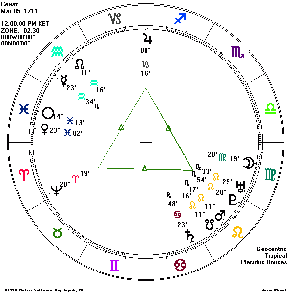 Следующий, особенно сильный Большой трин Юпитер-Нептун-Плутон сформировался в 1711 г. Когда этот трин в гео-системе стал очень точным (5 марта н. ст.), Пётр Первый издал указ о формировании правительствующего Сената, первого в отечественной истории органа, на который была возложена полнота власти в стране на время отсутствия царя (Пётр тогда много времени проводил в военных походах). Это событие знаменует собой структурирование вершины иерархии власти в России. Юпитер в первом градусе Козерога (знака структуры, управления) вполне отражает новую систему должностных полномочий власть предержащих и её чёткую регламентацию. Трин к Нептуну (находящемуся в совпаде с Лилит) на границе Овна и Тельца подчёркивает непреложность верховной власти Сената для народа; положение Плутона и Урана на исходе Льва подчёркивает чрезвычайный характер, вынужденность этой меры для поддержания постоянного контроля над ситуацией в стране. Это было решение, доселе невиданное в истории России.
