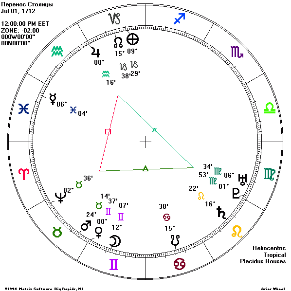 Перенос столицы из Москвы в Санкт-Петербург 1 июля 1712 г. н. ст. произошёл, когда и гео-, и гелио-Нептун был в трине к Плутону (соединяющемуся с Ураном) и в квадратуре к Юпитеру. Обращает на себя внимание стремление Петра народно признанные, устоявшиеся символы власти принудительно “привязать” (квадратура Нептун-Юпитер) к новому месту: высшую знать он заставил переехать в Петербург; резиденции царя и органов власти теперь размещались только там.