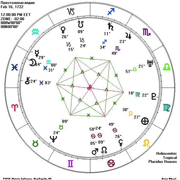 Мистический прямоугольник проявлен и в гороскопе Устава о престолонаследии - первого закона в истории России, имевшего статус основного (5 / 16 февраля того же года). Более того, оппозиция Венеры и Лилит довершила эту конфигурацию до равностороннего шестиугольника (т. наз. Звезда Давида). Эта редчайшая фигура помогает понять уникальное значение данного закона – ведь он давал императору право произвольно назначать себе наследника, что является уникальным прецедентом не только в истории России, но и в международной практике. Как раз Лилит в Раке на оппозиции к Венере в Козероге бросает вызов всем традициям наследования власти. Подключение этой пары к уже описанной нами конфигурации четырёх планет символизирует появление нового источника фигур власти. Не будь этого Указа, в нашей истории не было бы эпохи блистательных императриц и многочисленных дворцовых переворотов…
