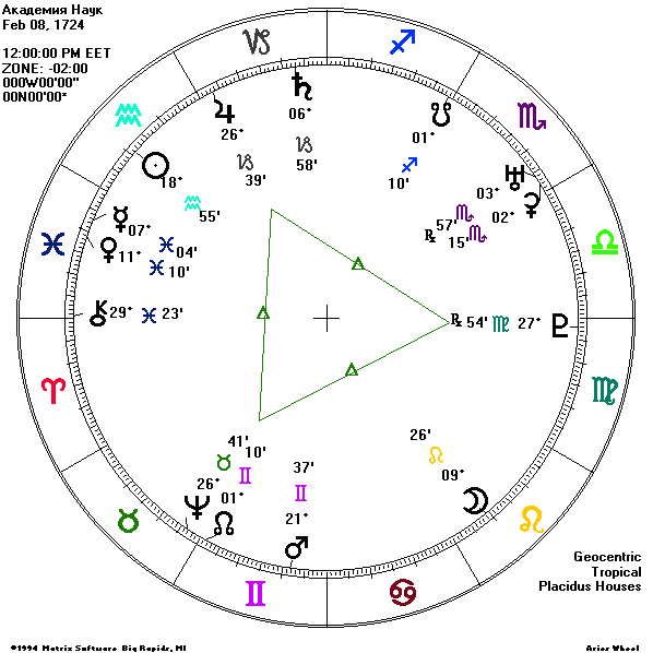 Большой Трин 1724 г. в самом конце земных знаков подытожил тему “закрепления основ”, “фундамента” Российской империи. Переход Юпитера из Козерога в Водолей вполне понятен в контексте смены эпох – от законотворческой, основополагающей, предписывающей эпохи Петра к сложным, смутным, неоднозначным временам, к калейдоскопу дворцовых переворотов и правления фаворитов. Укоренение новых, западных ценностей, идей и жизненного уклада на русской почве хорошо увязывается с положением Нептуна в соединении с Узлом Луны на рубеже Тельца и Близнецов. Зёрна обновления, посеянные Петром (Телец), дали всходы активных контактов с Европой и усвоения знаний западного мира (Близнецы). Посмотрите на гороскоп Российской Академии Наук 28 января (8 февраля) 1724 г. Учреждённая “по образу и подобию” западных академий, она стала первым ростком отечественной науки. Точный Большой трин в гео-системе подчёркивает локальный, внутренний масштаб этого события. Поступательное движение глобальных перемен в жизни России после смерти Петра не угасло (Плутон оставался в Деве и после перехода Юпитера и Нептуна в воздушные знаки).