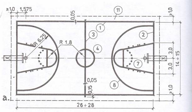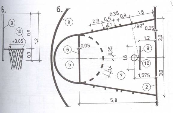б – разметка зоны перед щитом, в – размещение кольца с корзиной на щите: 1 – боковая линия; 2 – лицевая линия; 3 – центральная линия; 4 – центральный круг; 5 – область штрафного броска; 6 – линия штрафных бросков; 7 – трехсекундная зона; 8 – линия трехточковых бросков; 9 – щит; 10 – кольцо с корзиной; 11 – зона безопасности.