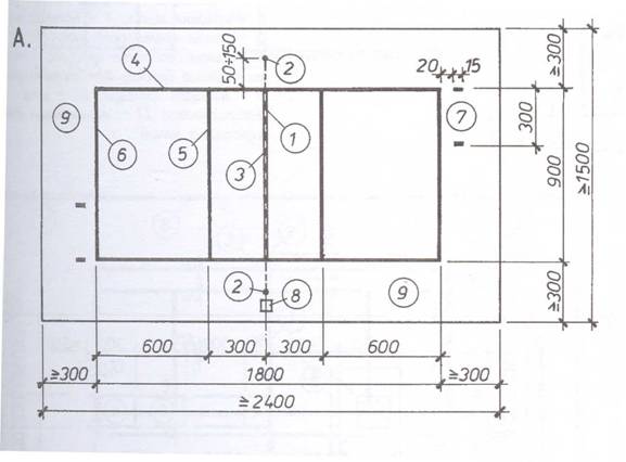План: 1 – сетка; 2 – стойка; 3 – подпорка; 4 – боковая линия для парной игры; 5 – боковая линия для одиночной игры; 6 – средняя линия; 7 – торцовое ограждение высотой не менее 3 метров; 8 – боковое ограждение высотой не менее 1 метра; 9 - фоны (рекомендуется зеленый цвет). Размеры в см.