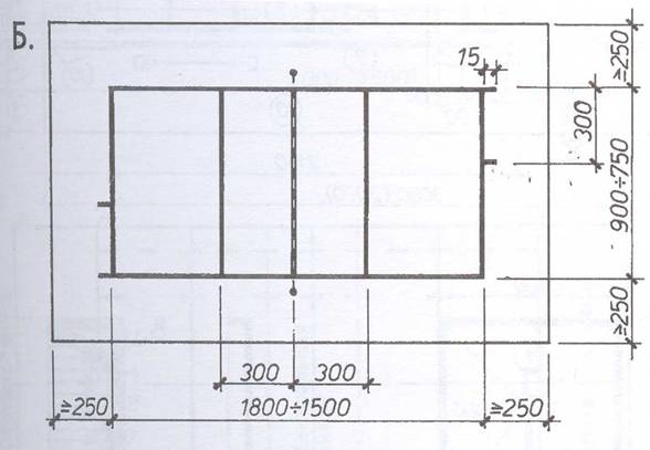 Б – габариты, разметка и оборудование стола: 3 – сетка; 4 – линии разметки стола.