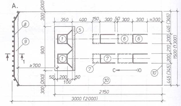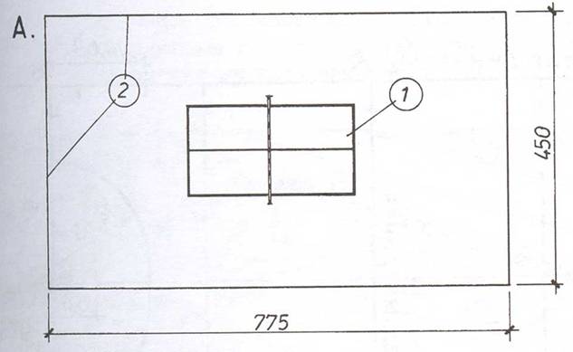 А – план площадки на 1 стол: 1 – стол; 2 – граница площадки.