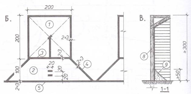 Б – план и разметка «городка»; В – ограждение и вал - разрез