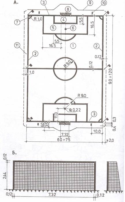 А – размеры и разметка: 1 - поле для игры; 2 – боковые линии; 3 – линии ворот; 4 – площадь ворот; 5 – штрафная площадь; 6 – отметка штрафного удара; 7 – угловой сектор; 8 – ворота; 9 – линия фоторепортеров; 10 – линия, ограничивающая расположение игроков защищающейся команды при угловом ударе; 11 – свободная площадь.