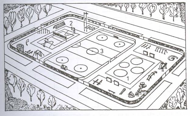Большинство игровых полей и площадок занимают небольшие площади и легко изолируются зеленью и сетками. Поэтому в отличие от спортивных ядер и полей для футбола их можно устраивать вблизи жилья, на участках с разной конфигурацией и рельефом.