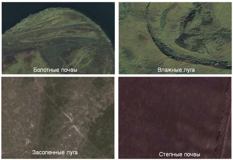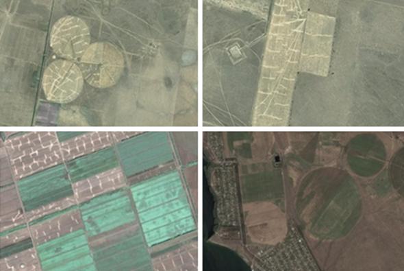 Рисунок 3 – Регулярно орошаемый массив (верхняя часть – пос. Коммунар, левобережье р. Волги 50 км от г. Волгоград; нижняя левая часть – левобережье Волги, 15 км от г. Николаевск, Волгоградская область; нижняя правая часть – с. Варваровка, 15 км от г. Волгоград)