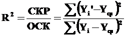 Сумма квадратов отклонений, объяснимая регрессией (СКР) – это сумма квадратов разностей между прогнозируемыми на основе найденного уравнения регрессии значениями Yi’ и средней из наблюдений в выборке Yср.