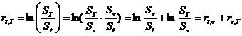 Второе преимущество логарифмических доходностей состоит в том, что они хорошо агрегируются во времени. Логарифмическая доходность от момента времени t до момента времени T эквивалентна сумме логарифмических доходностей на интервалах от t до t и от t до T, где