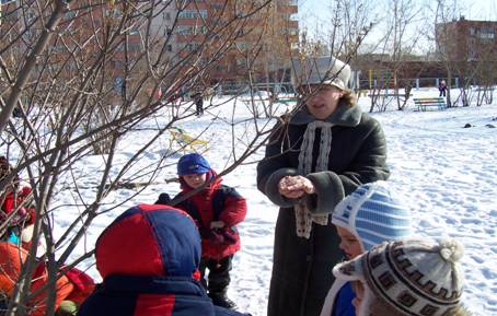 ЯНВАРЬ ЗАДАЧИ 1. Совершенствовать навыки поисковой деятельности детей: измерение глубины снега и температуру воздуха, измерение направления ветра. Развивать умение устанавливать связь между направлением ветра и между свойствами снега и состоянием погоды. 2. В наблюдениях за птицами выявлять взаимосвязи между формой клюва и питанием птиц. Выявить особенности взаимоотношений птиц во время еды 6 кормятся рядом, ссорятся, отгоняют друг друга и т. д. обобщить наблюдения детей за жизнью птиц зимой, вызвать желание помочь им. 3. Расширять кругозор детей за счет обогащения знаний детей о природе север России. Учить выделять приспособительные особенности растений и животных с севера к среде обитания. 4. Познакомить детей с огнем как явлением неживой природы. НАБЛЮДЕНИЯ И ОПЫТЫ · Наблюдение за температурой воздуха. Регулярно измерять температуру воздуха и заносить её в дневник наблюдений. В конце месяца обобщить эти наблюдения и сделать вывод, почему январь называют самым лютым из всех зимних месяцев. · Наблюдение за состоянием снега. Уточнить зависимость температуры воздуха и состоянием снега (липкий, рыхлый). Наблюдение за явлением снеговал: на деревьях образуются снежные навесы – шатры при этом молодые, тонкие деревца могут ломаться. · Наблюдение за сугробами. Выявить связь между силой ветра и формой, местонахождения сугробов. Измерить условной меркой глубину сугробов до и после снегопада. Сделать вывод, почему в одних местах снег глубокий, а в других его почти нет. · Наблюдение за поведением птиц на кормушке. Ориентироваться по следам на снегу; кто из птиц прилетал к кормушке. Выяснить какой корм какой птице нужен. Отметить особенности поведения воробьёв: задорно чирикают – чувствуют прибавку света. Если воробей нахохлился – к морозу, пёрышки приглажены – к теплу. В январе уже можно услышать песенку синицы. Сделать вывод о том, что птицы первыми реагируют на прибавление света. · Наблюдение за деревьями. После сильных морозов рассмотреть кору деревьев, есть ли морозобойные трещины на стволе, рассказать детям, как образуются трещины. Рассмотреть почки на деревьях, напомнить, что дерево – живое, и весной из почек распустятся листья. ФЕВРАЛЬ ЗАДАЧИ 1. В наблюдениях обобщить знания детей о зимних явлениях в природе, продолжать развивать поисковую деятельность детей: по направлению ветра, по движению веток определять силу ветра и его направление; сравнивать зимние явления: вьюга, позёмка. 2. Закреплять знания детей о деревьях, растущих на участке, сравнивая их по стволу, коре, расположению веток. 3. Развивать у детей умение устанавливать взаимосвязи в экосистеме на уровне частных и обобщённых понятий, сформировать представление о пищевой зависимости живых существ как основной взаимосвязи в природе. 4. Формировать представления о приспособлении человека к зиме (внешний вид, поведение, труд, отдых); о правилах поведения в экстремальных ситуациях зимой. Закрепить представление о том, что здоровье человека зависит от правильного удовлетворения его жизненно важных потребностей. 5. Воспитывать у детей осознанное отношение ко всем животным, понимание того, что все нужны друг другу, что вредных животных не бывает. НАБЛЮДЕНИЯ И ОПЫТЫ · Наблюдения за продолжительностью светового дня. Дети замечают заметное прибавление светового дня, для эт
