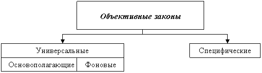 Существуют две группы объективных законов: универсальные и специфические. Действие универсальных законов распространяется на социальную, биологическую и частично – техническую системы. К этой группе относятся основополагающие и фоновые законы. Основополагающие – закон синергии, закон самосохранения и закон развития. Фоновые – закон информированности – упорядоченности, закон единства анализа и синтеза, закон композиции – пропорциональности. Специфические законы объединяют ряд законов, касающихся только социальных организаций.