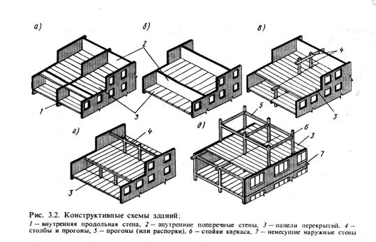 Остов определяет конструктивную схему. В зависимости от характера опирания горизонтальных несущих элементов (перекрытий) на вертикальные несущие элементы (стены, отдельные опоры и балки между ними) различают следующие конструктивные схемы гражданских зданий (рис. 3.2.):