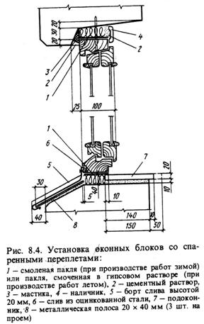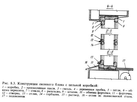 По конструктивному решению оконные коробки бывают раздельные и общие. Оконные коробки обязательно покрывают антисептиком и по периметру обкладывают слоем рубероида. Коробки в стенах укрепляют ершами в швах кладки или гвоздями, которые забивают в специально установленные деревянные пробки. Зазор между коробкой и стеной тщательно проконопачивают паклей, вымоченной в гипсовом растворе.