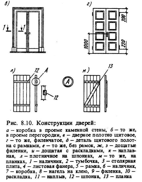 Для изоляции друг от друга проходных помещений и входа в здания служат двери. Их расположение, количество и размеры определяют с учетом числа людей, находящихся в помещениях, вида здания и других факторов. Двери состоят из коробок, представляющих рамы, укрепленные в дверных проемах стен, и полотен, навешиваемых на дверные коробки.