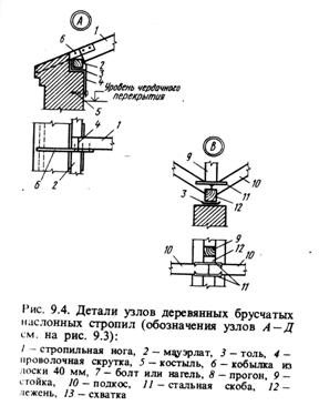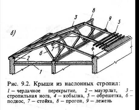 На рисунке показана двускатная крыша, образованная из наслонных стропил (стропильных ног) опирающихся на мауэрлаты (подстропильные брусья). Мауэрлаты могут быть из брусьев, укладываемых по всей длине здания, а также в виде брусьев – коротышей, укладываемых прерывисто (только под стропильные ноги). При пролете более 5 м стропильные ноги необходимо дополнительно поддерживать подкосами. Расстояние между стропилами принимают от 0,8 м до 1,7 м. На внутренние опоры укладывают прогоны, по которым через 3 – 6 м друг от друга устанавливают стойки, поддерживающие верхние прогоны. Нижние концы стропил обычно не выходят за пределы мауэрлата. Для крепления обрешетки в карнизной части крыши к стропильным ногам прибивают короткие доски – кобылки.