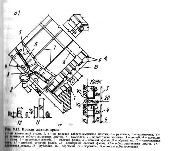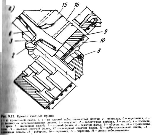 Конек и ребра крыши покрываются специальными фасонными элементами-шаблонами, а ендовы - оцинкованной кровельной сталью. Кровли из волнистых асбестоцементных листов долговечны, огнестойки, имеют красивый внешний вид, экономичны в эксплуатации, но обладают достаточным весом и хрупкостью.