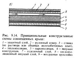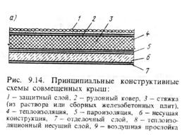 Конструкция невентилируемой совмещенной крыши следующая: по железобетонной плите устраивают пароизоляцию из одного или двух слоев рубероида на битумной мастике для защиты вышерасположенного теплоизоляционного слоя от увлажнения водяными парами, проникающими из помещения через плиту. Толщина теплоизоляционного слоя определяется расчетом. По утеплителю устраивают выравнивающую цементную стяжку толщиной 15-20мм, а при сыпучем утеплителе ее слой принимают толщиной 25-40мм и армируют сеткой из проволоки диаметром 2-3мм с размером ячеек 200-300мм. По стяжке устраивают кровлю из многослойного рулонного ковра (рубероида или другого материала) и защитного слоя из мелкого гравия толщиной 6-8мм.