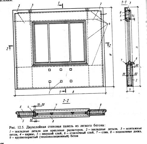 Двухслойные панели состоят из несущего слоя из легкого или тяжелого бетона класса В10…В15 плотностью более 1000 кг/м* и утепляющего слоя - из теплоизоляционного легкого или ячеистого бетона. Толщина несущего слоя для стеновых панелей должна быть не менее 60 мм, и располагают его с внутренней стороны помещения.