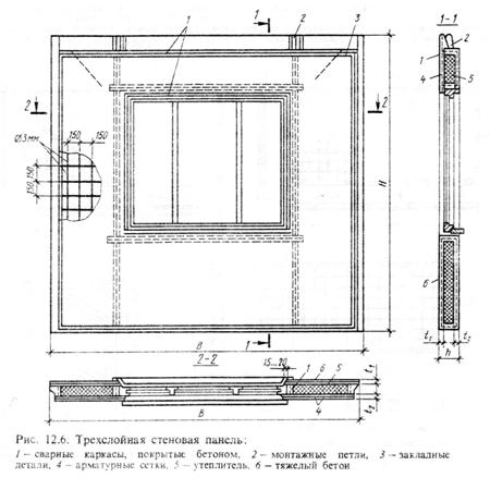 Трехслойные панели состоят из двух тонких железобетонных плит и эффективного теплоизоляционного слоя, укладываемого между ними. В качестве утеплителя применяют полужесткие минераловатные плиты, фибролит, асбестоцементные плиты, пеностекло, пеносиликат и другие.